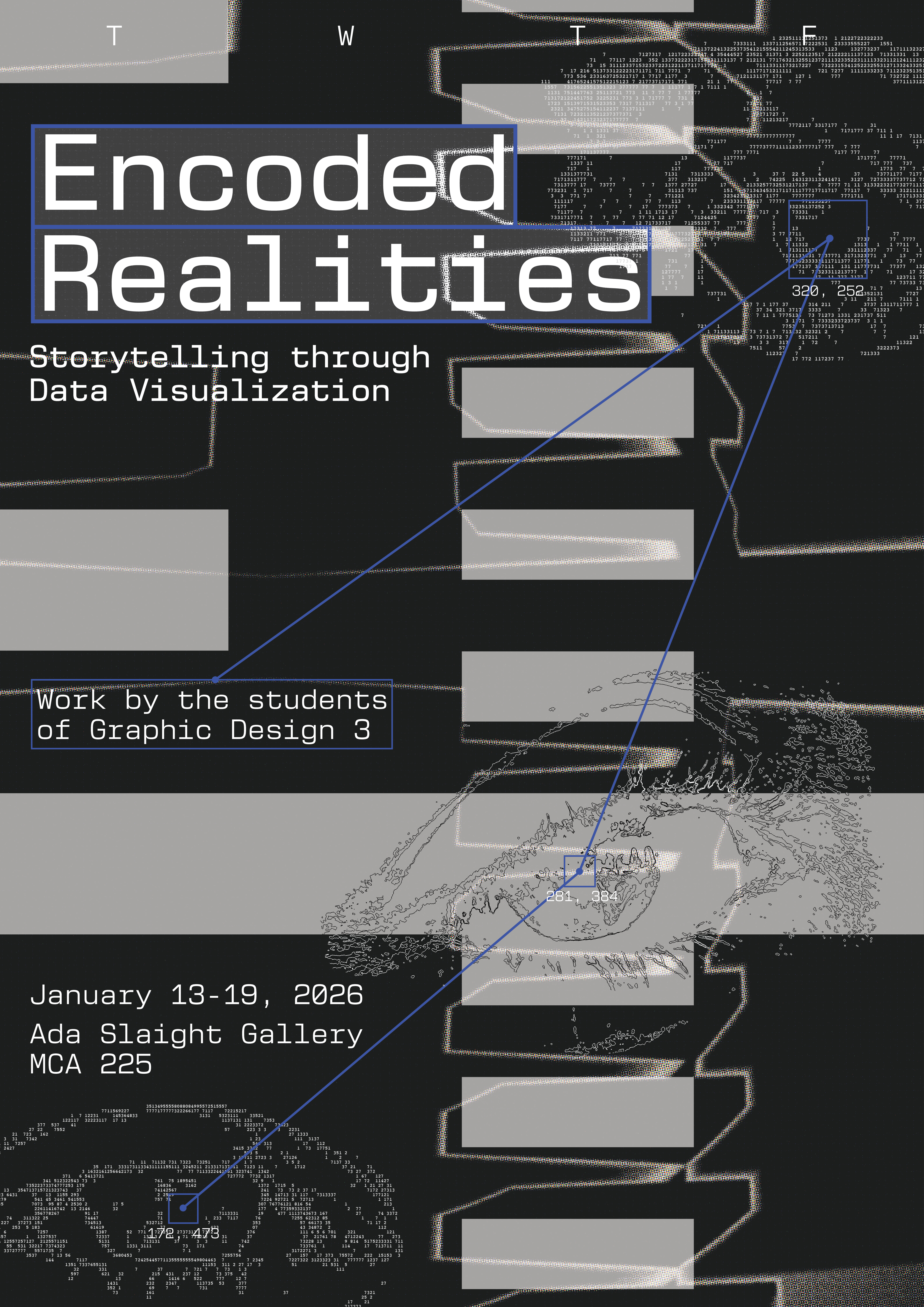 The Encoded Realities exhibition poster hung up in the Ada Slaight Gallery at OCAD University.