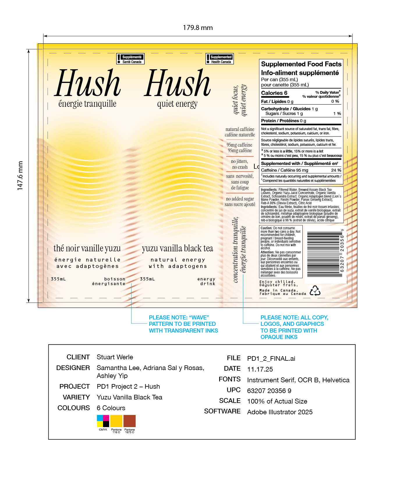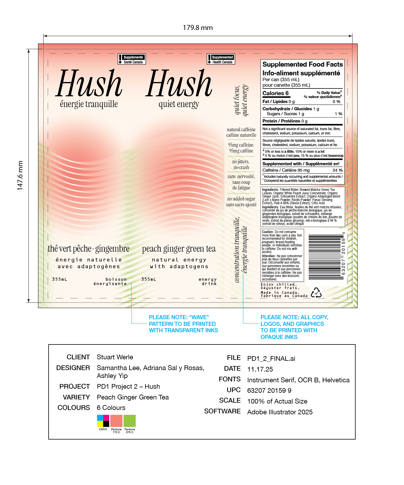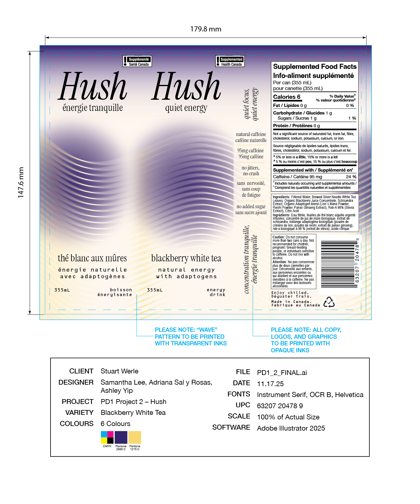 The final packaging design reflects Hush’s brand positioning as a mindful, natural energy drink through soft gradients and blurred lines. The repeating wavy lines have hints of colour corresponding to the tea in the formula, representing the "flow state" and steady stream of energy that Hush’s natural caffeine provides. Everything is blurred, as if the surroundings have gone quiet, aligning with our slogan “Quiet Energy” and the light but fruity flavours.