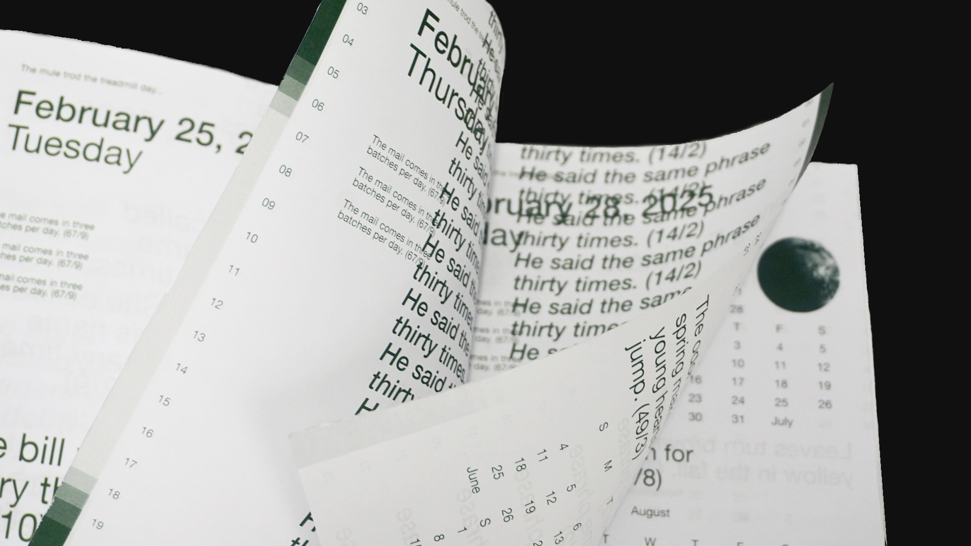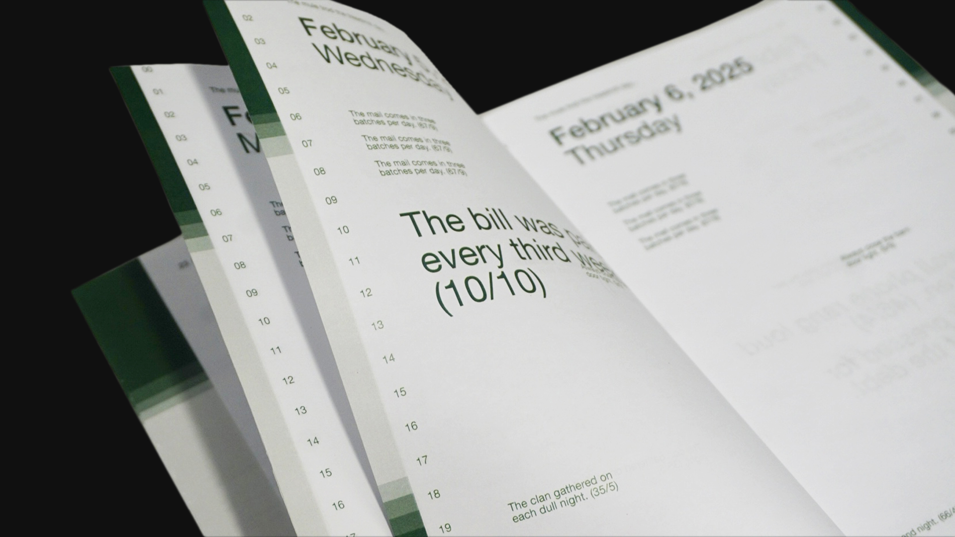 Each section of the book slowly zooms in on time, starting from a monthly calendar to a weekly one to a daily calendar. The latter establishes the daily routine and shows how it is being perpetually disrupted. After February 2025 ends, the timeline moves forward, zooming out to seasons and years.
