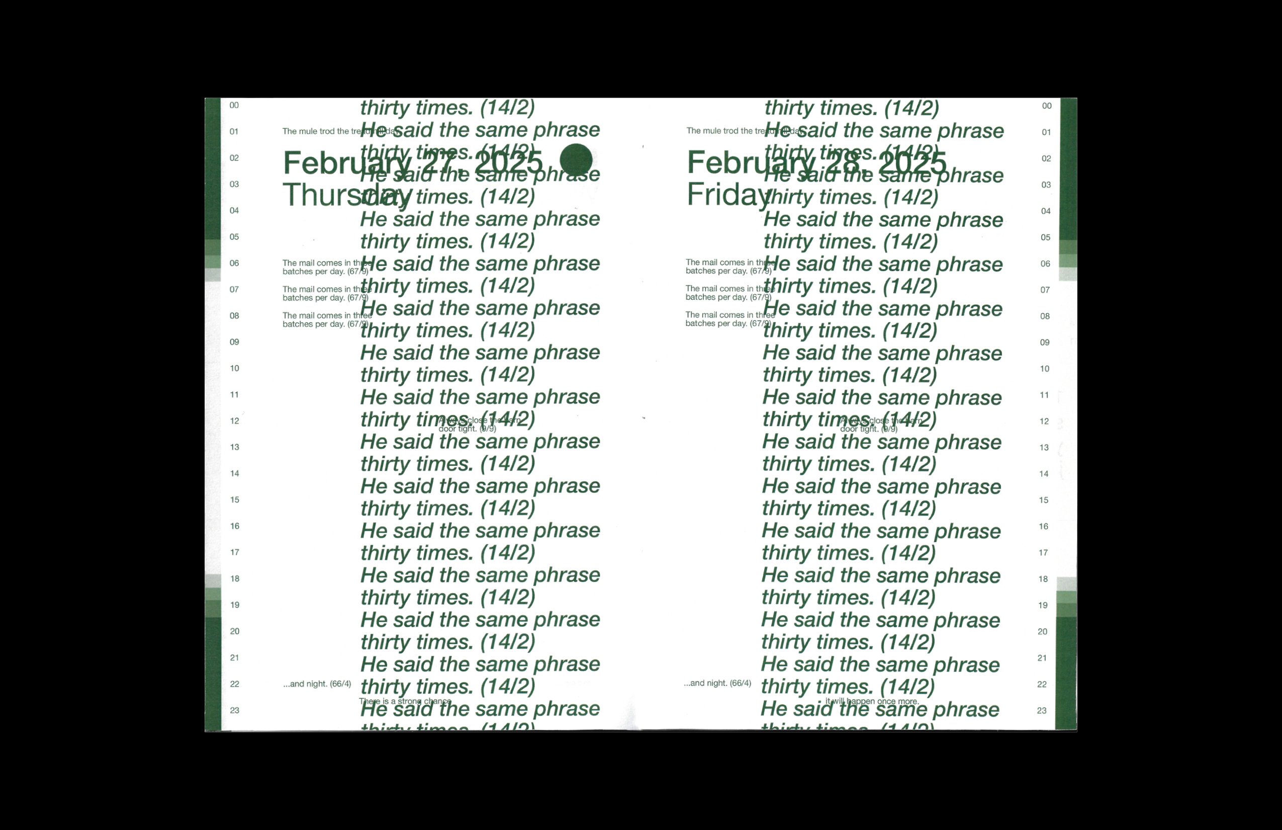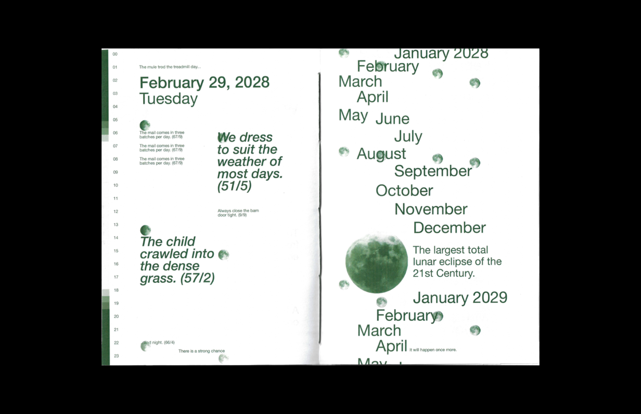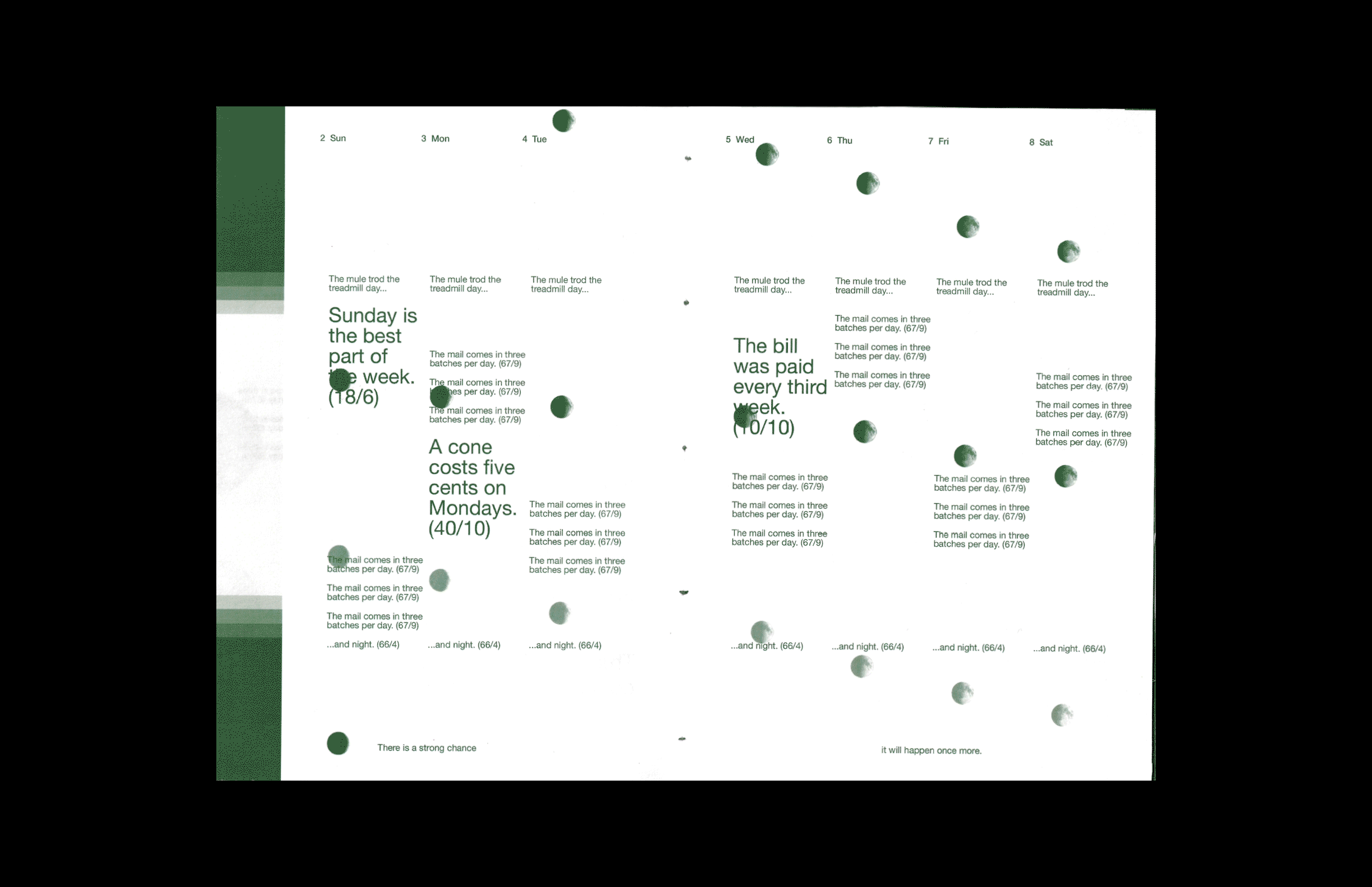 There is a Strong Change it Will Happen Once More is a publication about routine and time derived from a curated collection of the 720 Harvard Sentences. These themes are supplemented by major solar and lunar events, hours of daylight, moonrise and moonset, and the moon cycle, highlighting the repetitive systems of time that we live under.