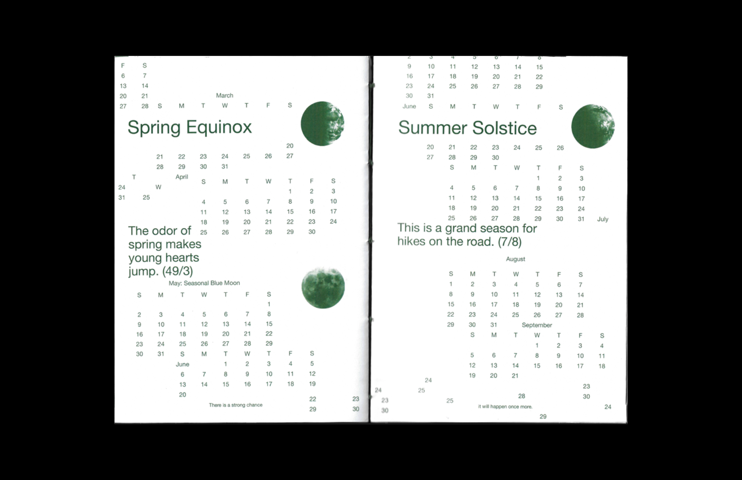 Each calendar type has a corresponding hierarchy of lunar and solar routines. The weekly calendars have the moon phase, moonset, moonrise, and meridian passing aligned to each hour of the day. This is found on the left side of the spread which also shows the average sunrise and sunset times for that week, creating a pseudo flip-book effect. The daily calendars have the moon phase and sunrise and sunset times. The seasonal calendars mark the solstices and equinoxes, and the yearly calendar shows any major lunar or solar event such as an eclipse.
